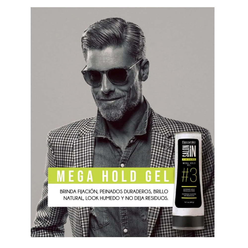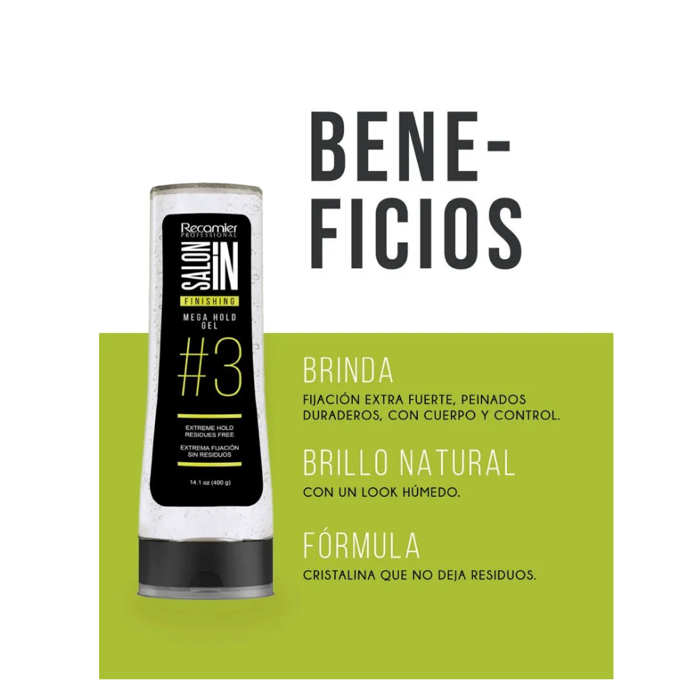 Gel Mega Hold de la línea Salon In de Recamier 400 g es un gel de peinado profesional diseñado para proporcionar una fijación extremadamente fuerte y duradera.