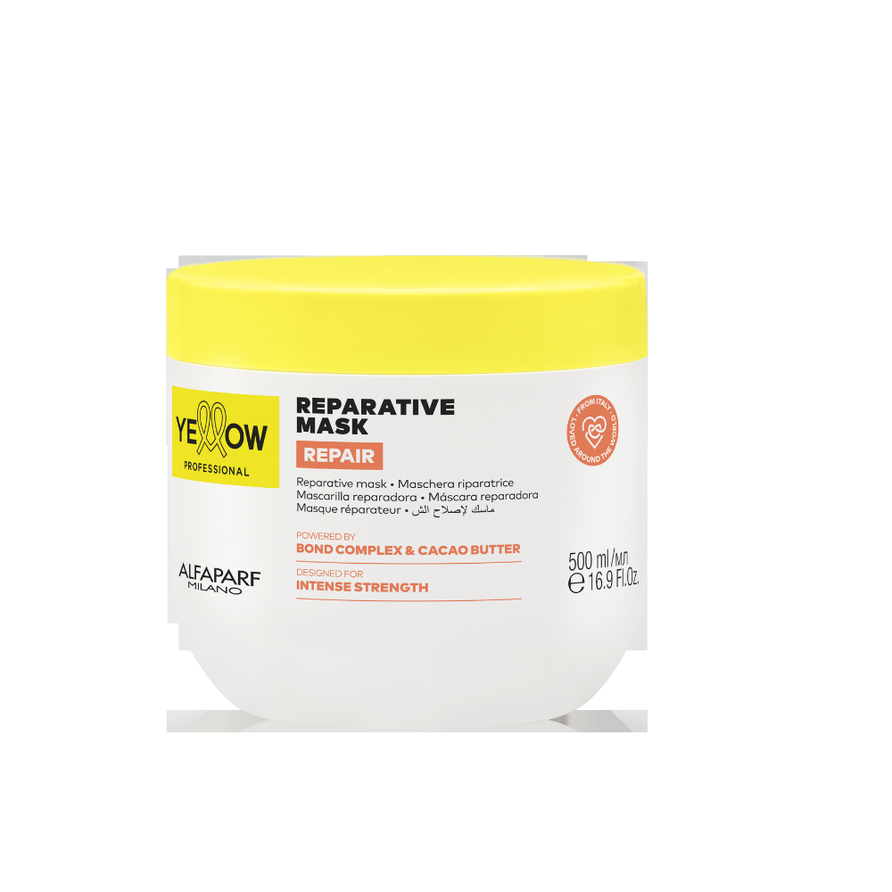 Yellow Repair Mascarilla funciona como reestructurante para cabellos extremadamente dañados.