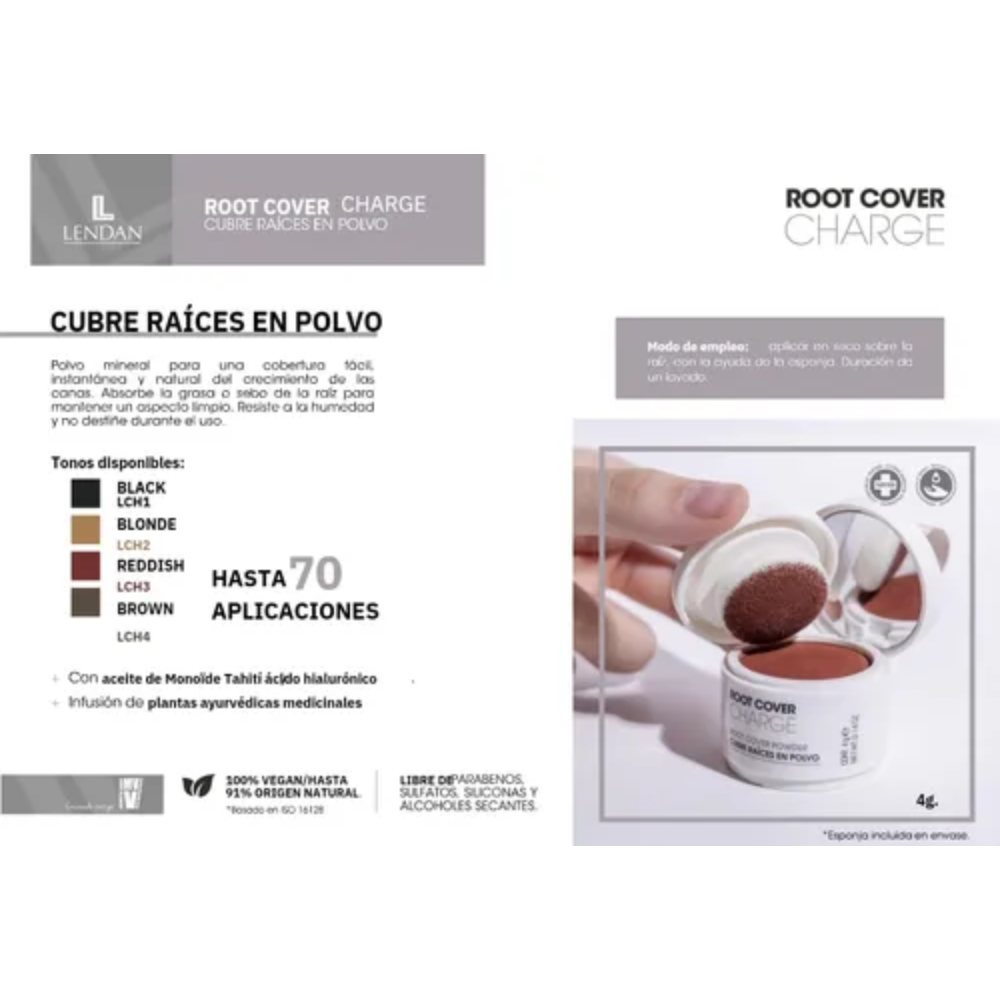Es un polvo mineral que ofrece una cobertura fácil, instantánea y natural del crecimiento de las canas y las raíces entre coloraciones. A diferencia de los sprays, este formato en polvo se aplica con una esponja, lo que permite una mayor precisión.