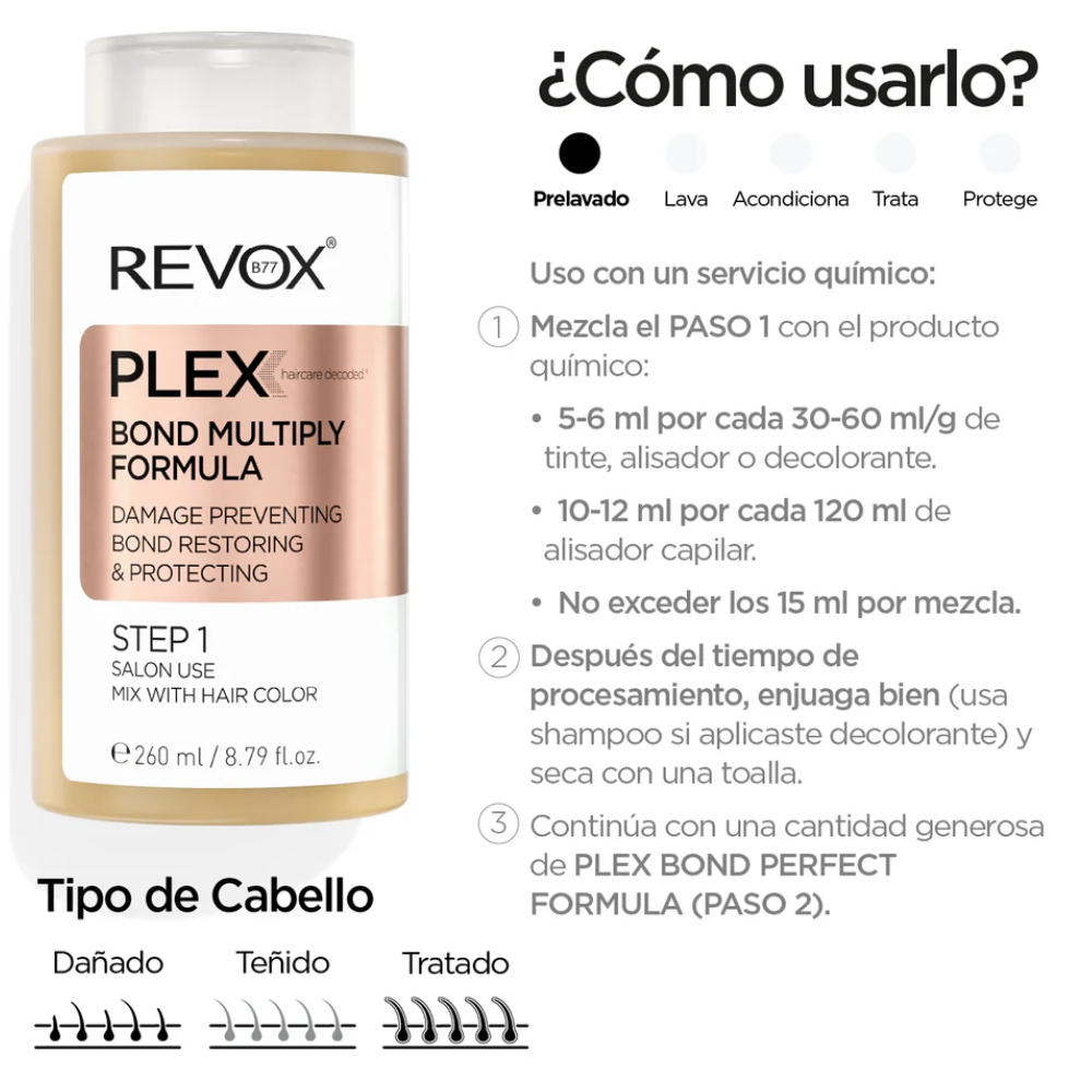 Revox B77 Plex Hair Perfector N°1 es el primer paso de un sistema de tratamiento capilar en tres fases (N°1, N°2 y N°3) diseñado para restaurar y fortalecer el cabello dañado y tratado químicamente. Se enfoca en la reparación de enlaces a nivel molecular.