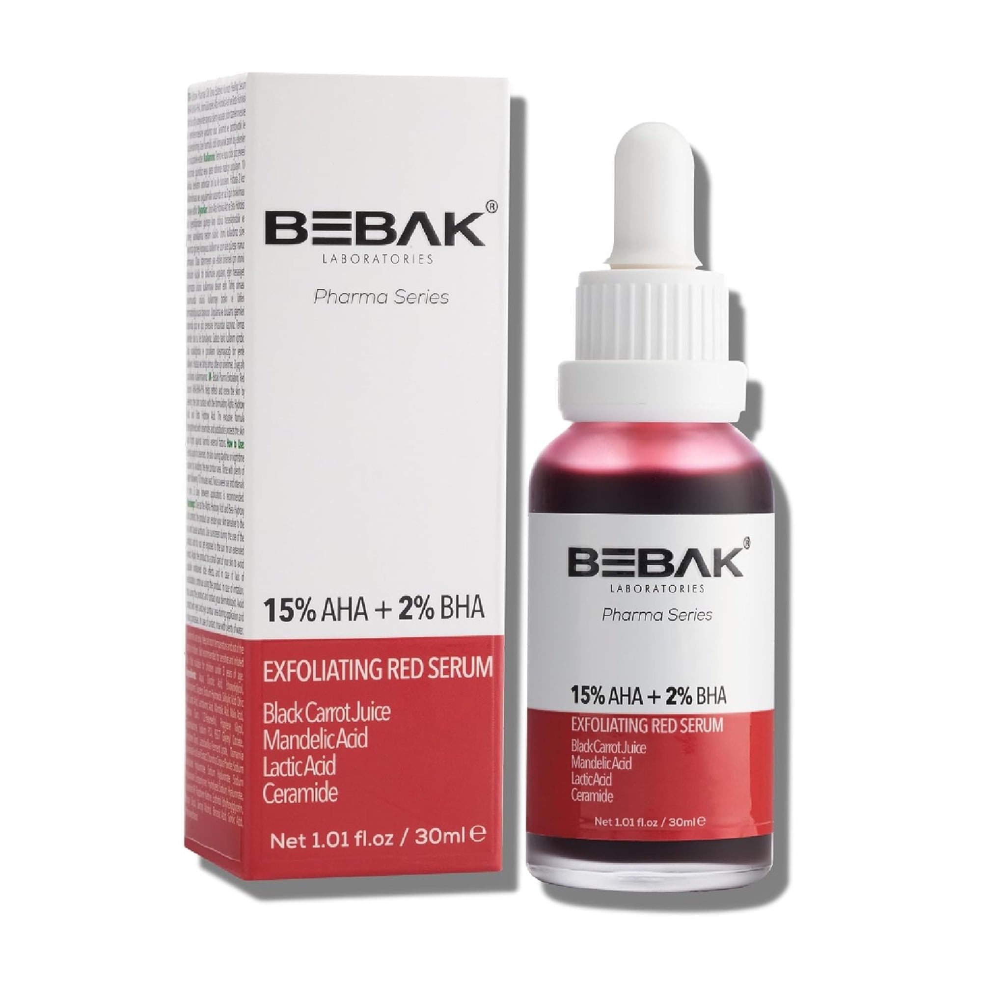 Bebak Pharma Skin Tone Unifying Red Exfoliating Serum 15% AHA – 2% BHA ayuda a refrescar y renovar la piel al exfoliar la superficie de la piel con la formulación de alfa hidroxiácidos y beta hidroxiácidos. La fórmula exclusiva reforzada con ceramidas y postbióticos protege la piel y lucha contra los factores externos dañinos. Ayuda a eliminar las células muertas en la capa más externa de la piel y le da a la piel un aspecto más suave, limpia los poros y minimiza la apariencia porosa, unifica el tono de la piel y la resalta. El color rojo proviene del extracto de zanahoria negra.