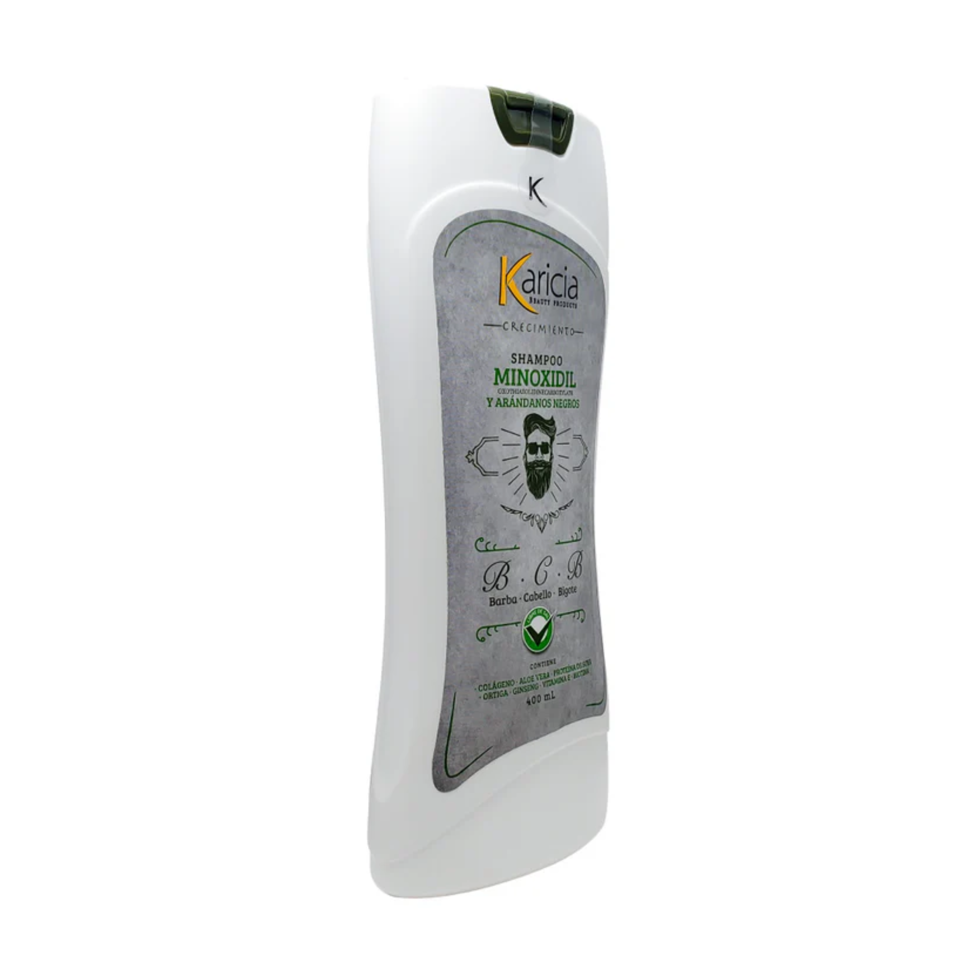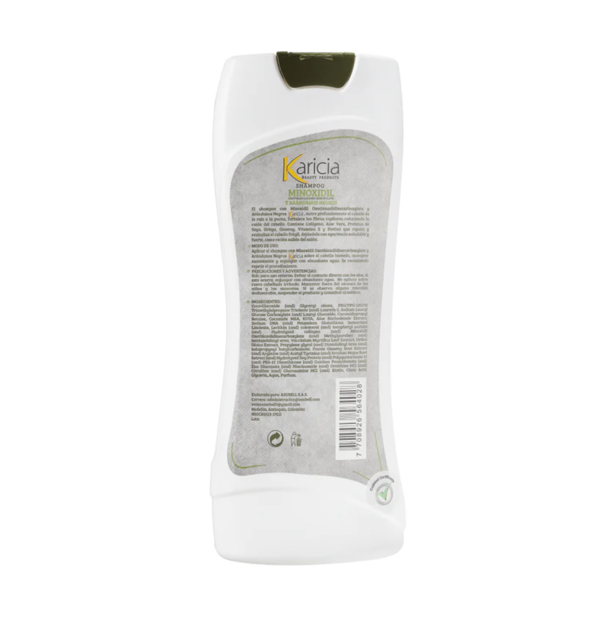 Shampoo Karicia con Minoxidil y Arandanos Negros Estimula el cuero cabelludo ayudando al foliculo a desarrollar y engrosar el cabello, tambien ayuda a estimular el crecimiento de la barba para mantenerla frondosa y con un gran volumen.